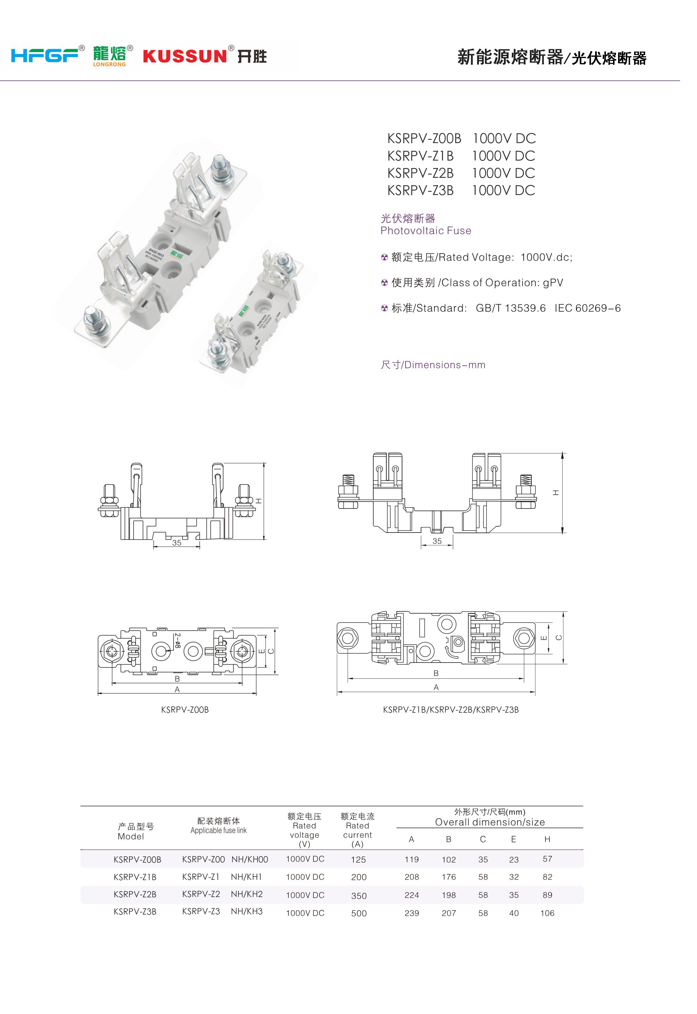 • KSRPV-Z 1000VDC 系列光伏熔斷器及底座/新能源熔斷器
